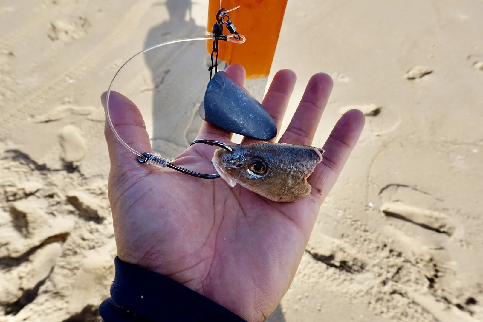 For bait, the head of a small/medium sized fish is preferable to crab. Why? While crab is a great bait for drum, it doesn’t always hold up to the rigors of casting 80-100+ yards and the rough waters we target. So for this I like to use spot and mullet heads, however, I will sometimes use bluefish, croaker and whiting heads also. I prefer to catch my own bait and this is where a shorter rod gets the call. This rod can be in the 7-9’ range and a medium to medium heavy action, which perfectly handles the job of catching bait from the surf and makes easy work of casting double-drop bottom rigs and detecting the light bites of spot, croaker, and whiting.